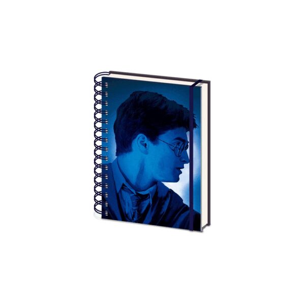 ¡¡Mira que pasada de libreta o cuaderno!! Es de tamaño aproximadamente A5 (14 cm x 21 cm), con encuadernación o-wire, su goma para atar y todo, y su diseño está basado en una de las sagas de libros y películas más exitosas de los últimos años, Harry Potter.