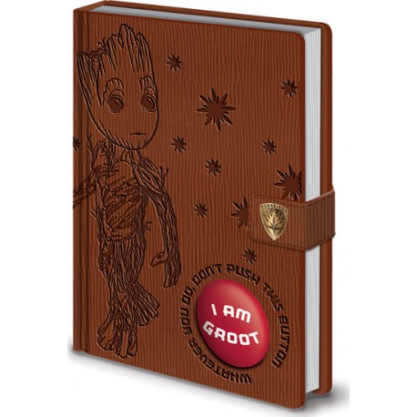 Pero lo mejor es su genial diseño, en el que aparece reproducido perfectamente en relieve Groot, en su versión más juvenil. Fíjate además en el cuidado aspecto arbóreo del exterior de la libreta, como el cuerpo del propio Groot, y en el detalle del cierre, con el escudo de los Guardianes de la Galaxia. En la portada encontramos además un botón rojo como ese que aparece en la peli, que si lo pulsas sonará la frase favorita de este personaje: I Am Groot.