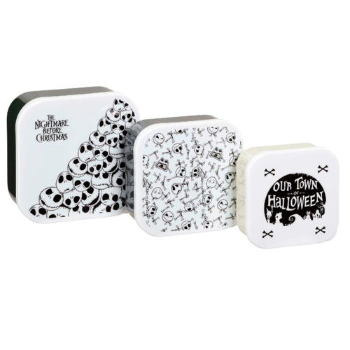 Se trata de 3 fiambreras de diferentes tamaños, y que pueden guardarse una dentro de otra como si fueran muñecas rusas. Cuentan con un diseño realmente práctico, además de una calidad fantástica tanto en la impresión de los dibujos, como en el material y unos acabados realmente conseguidos. Pero lo realmente maravilloso es su diseño, con el mítico logo de Nightmare Before Christmas y también el rostro de su principal protagonista, Jack Skellington.