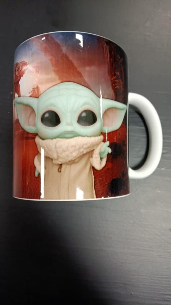 Taza con una imagen muy graciosa de baby yoda en funko, la taza es de 350 ml