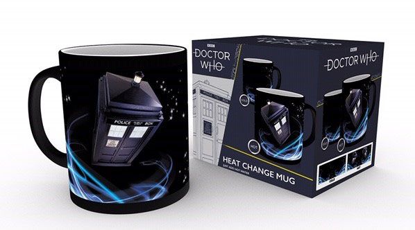 Esta taza térmica está fabricada en cerámica y tiene 300 mililitros de capacidad. En su estado normal muestra una imagen del vacío del espacio. Cuando se vierte un líquido caliente en su interior y la superficie de la taza se calienta, entonces se muestra la imagen la TARDIS viajando a través del espacio. Este producto no puede ser usado en el microondas ni puede lavarse en lavavajillas. Es necesario su lavado a mano para evitar el deterioro de los materiales que permiten el efecto con el cambio de temperatura. Se trata de una licencia oficial de Doctor Who fabricada por GB Eye.
