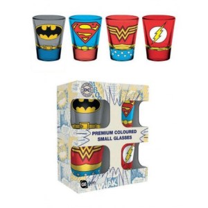 Sorprende a tus invitados con este set de 4 vasos de chupitos de Liga de la Justicia, realizados en cristal.